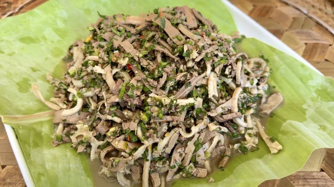 在耿马自治县的傣家竹楼间、节庆宴席上,凉拌牛撒撇始终是不可或缺的灵魂佳肴。这道承载傣族饮食智慧的非遗美食,以苦、凉、辣为鲜明特色,口感清鲜回甘,兼具健胃、清暑去热、增进食欲的养生功效,既是傣家招待贵宾的招牌菜,也是日常餐桌的烟火滋味,其独特的苦甘风味,早已成为舌尖上难忘的傣乡印记。