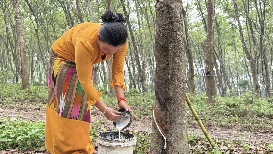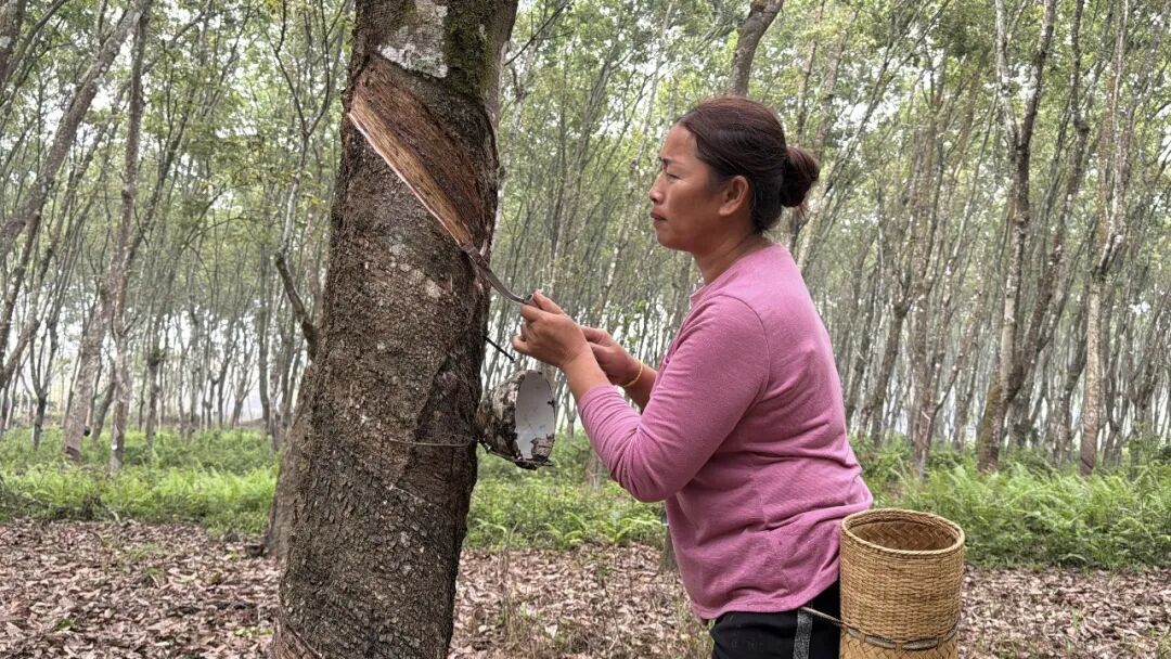 胶农 允布说:“我们家有30多亩胶林,平时我们割好胶水,就有胶厂来收,而且还有指导人员来帮我们指导,让我们胶水品质更好。”