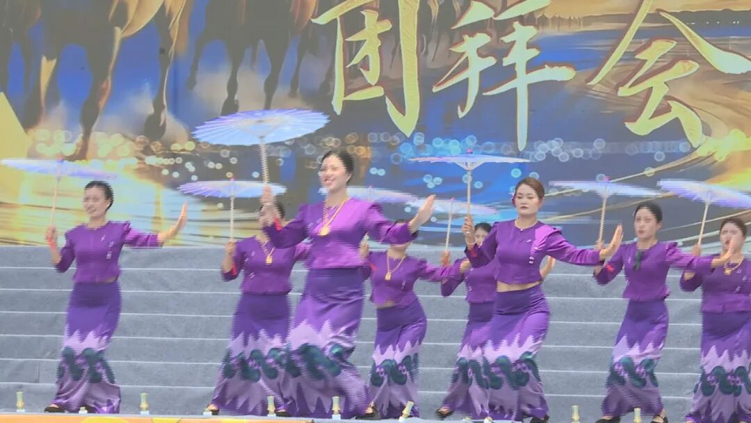 团拜活动上,各乡、镇、民族乡的团拜队伍,身着绚丽多彩的民族服饰,携带特色地方特产,遵循传统民俗依次入场团拜。