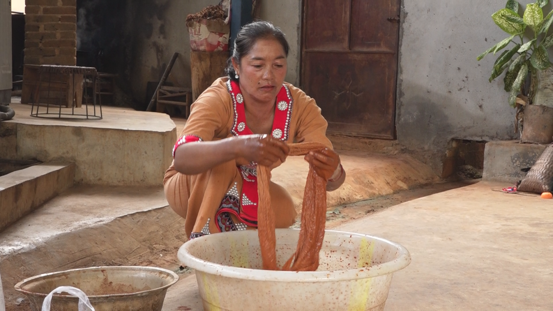 李金花手中的黄色布料,皆以黄土、红土、包谷沙、灶灰、茶叶等天然材料染色,经选料、捣碎、熬煮等七道工序制成,这门“天然染色+自纺自织”的手艺,早已将佤族人的“黄色崇拜”深深地织进了经纬。