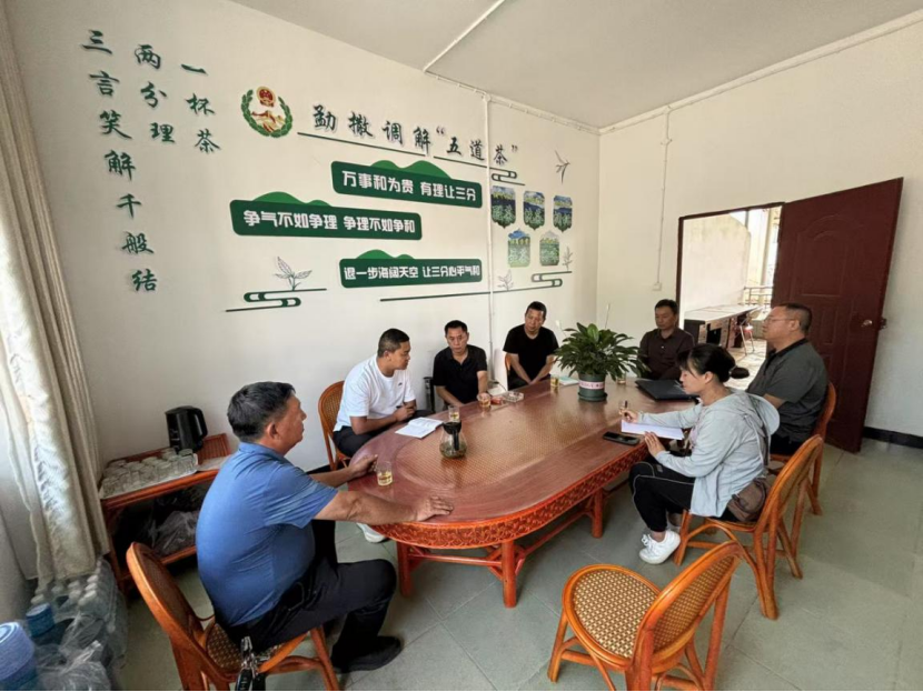 立足本地茶资源禀赋与文化底蕴,勐撒镇党委创新赋予古老茶道智慧新的社会治理使命,将“醒茶、洗茶、润杯、品茶、回味”深度融入矛盾化解实践,精准对应“平复情绪、梳理事实、疏导心结、协商方案、巩固成果”五大关键环节,使袅袅茶烟化作消融隔阂的天然媒介。实践中,调解员如茶艺师般引导当事人:从递上清茶平复激烈情绪的“醒茶”开场,到抽丝剥茧厘清脉络的“洗茶”析因,再到情理法多维度交融打开心结的“润杯”疏导,继而以平等协商共谋方案的“品茶”破题,最终以跟踪回访巩固成果的“回味”收尾,环环相扣,步步深入、层层递进。“五道茶”调解法推行以来,成功化解2起积压多年的邻里纠纷及土地争议,累计调处矛盾350起,成功率达99.1%,真正让茶香弥漫之处,纷争渐息,共识渐生。