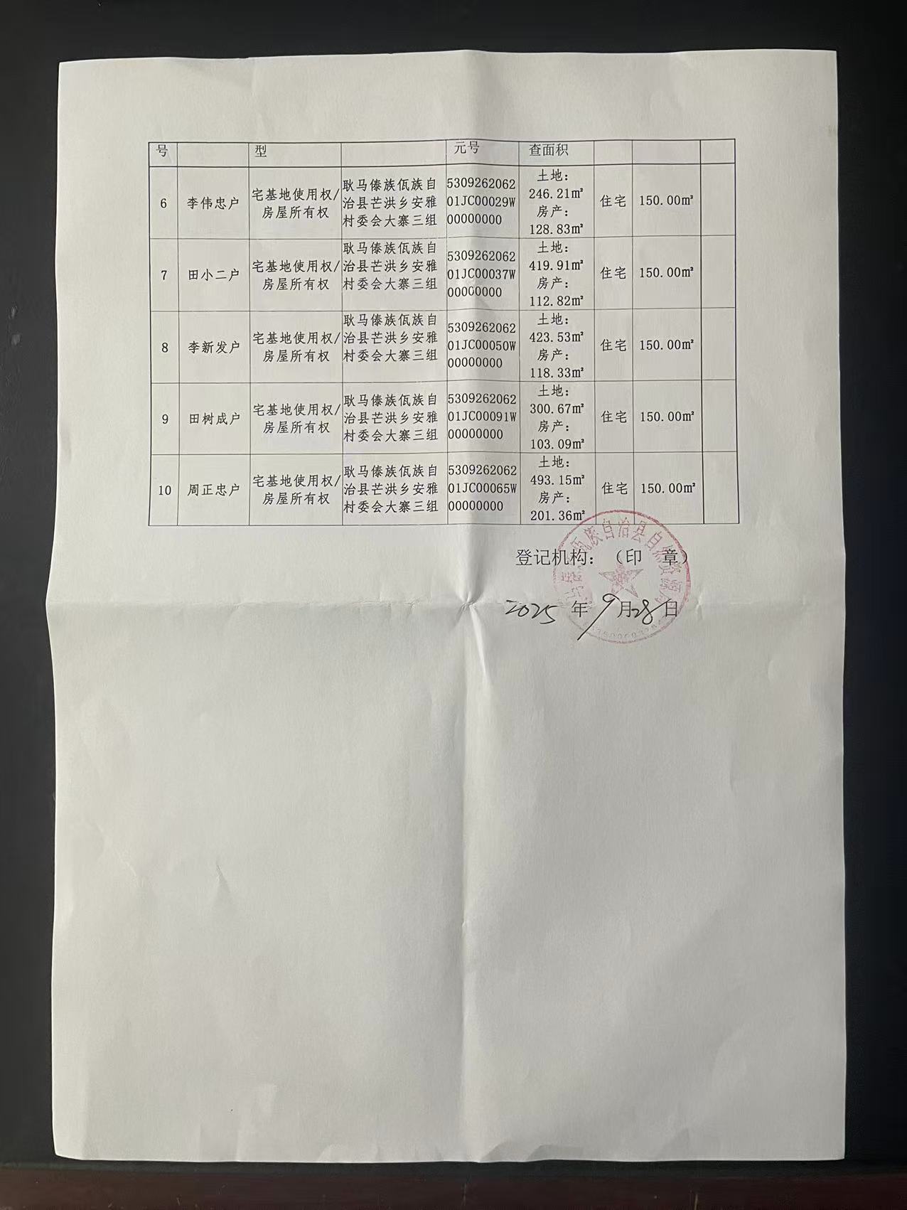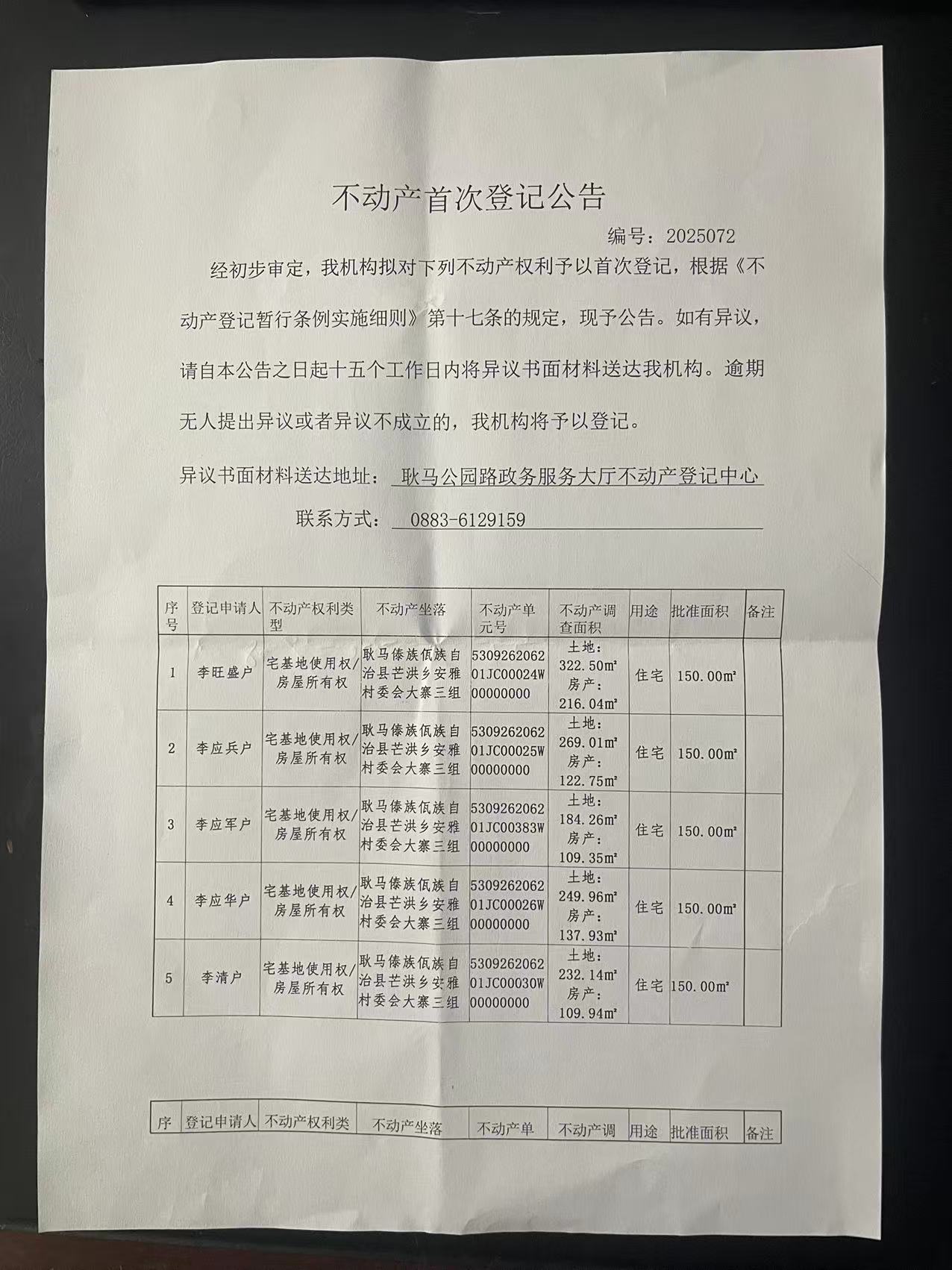 不动产首次登记公告(芒洪乡安雅村大寨3组10户)