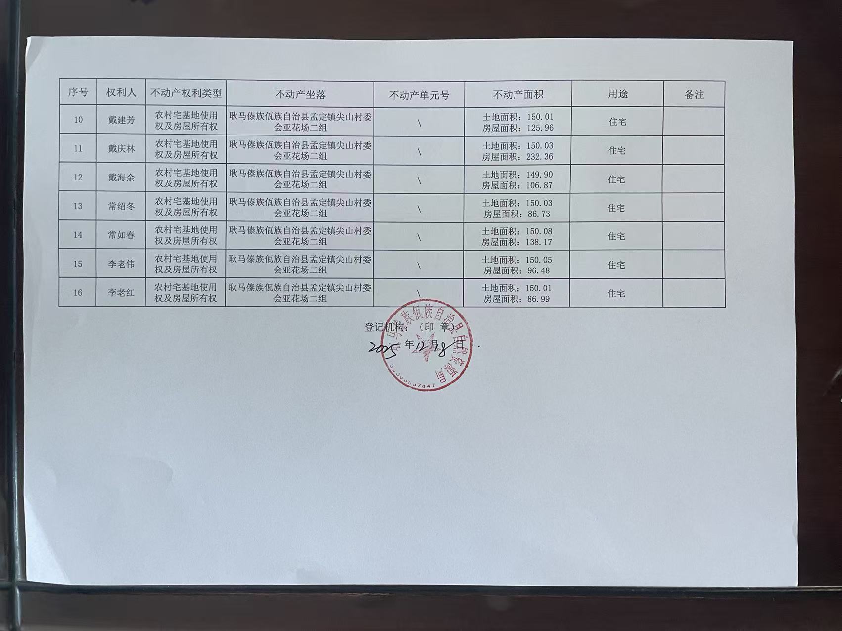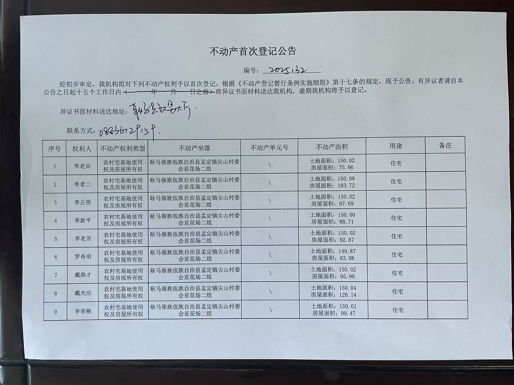不动产首次登记公告(孟定镇尖山村亚花场二组9户)