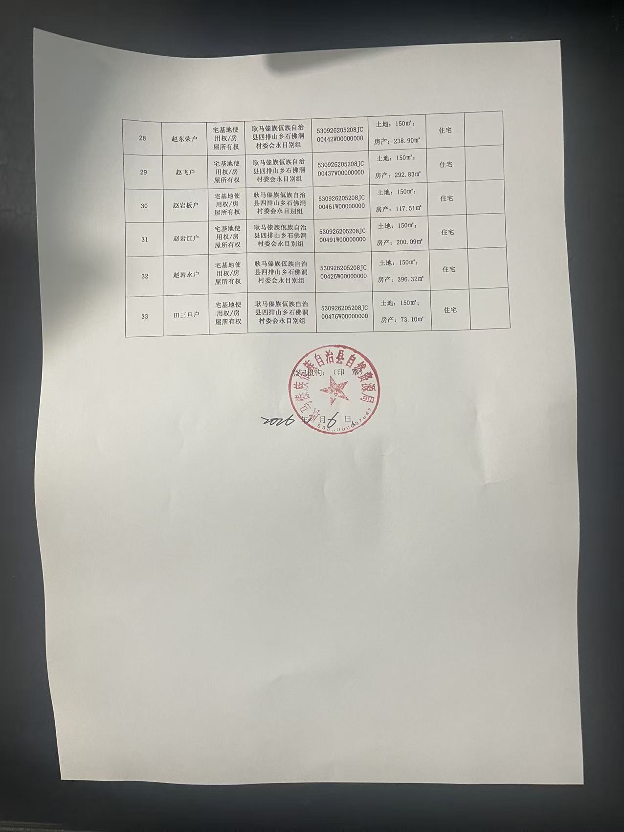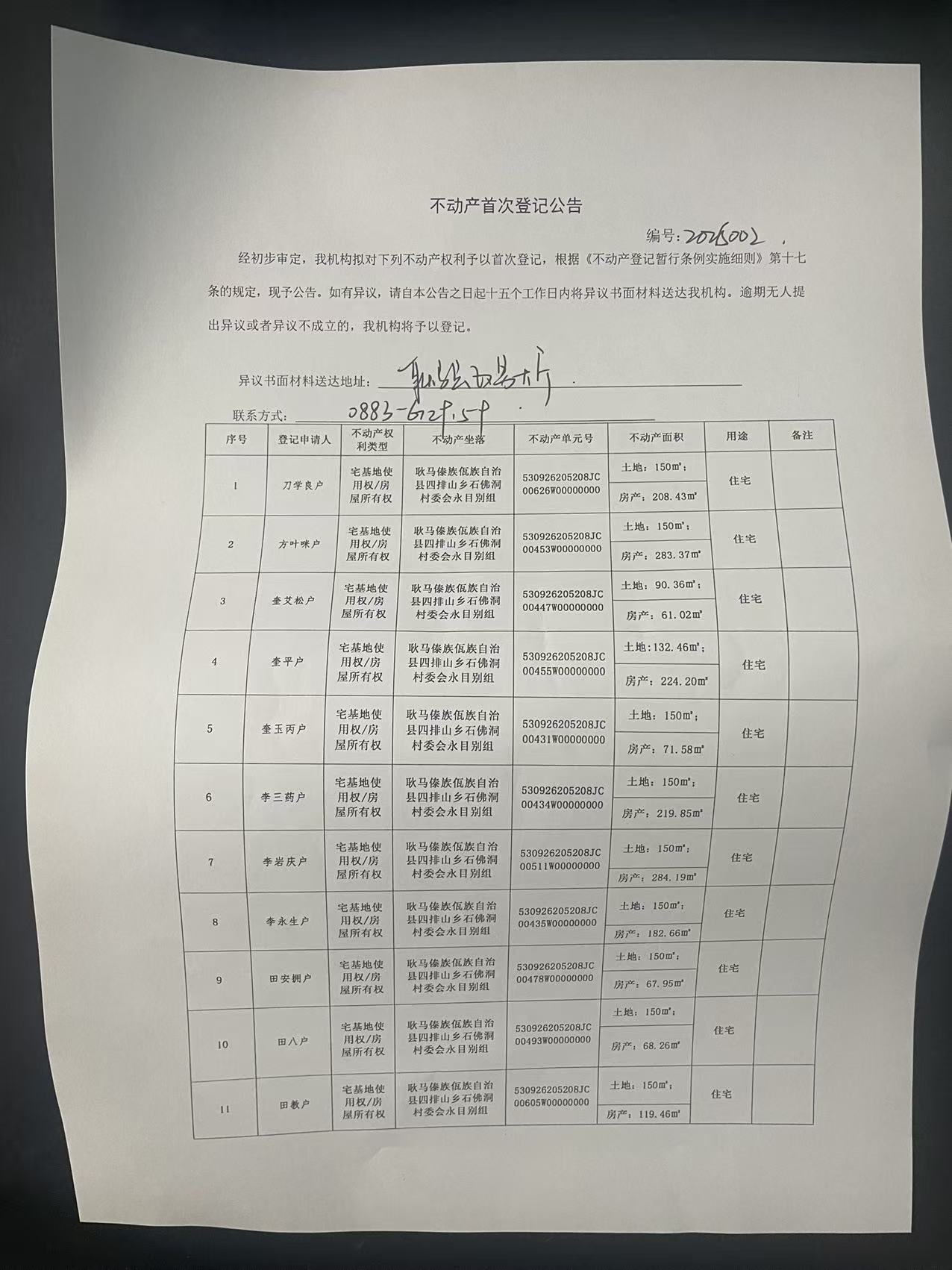 不动产首次登记公告(四排山乡石佛洞村永目别组33户)