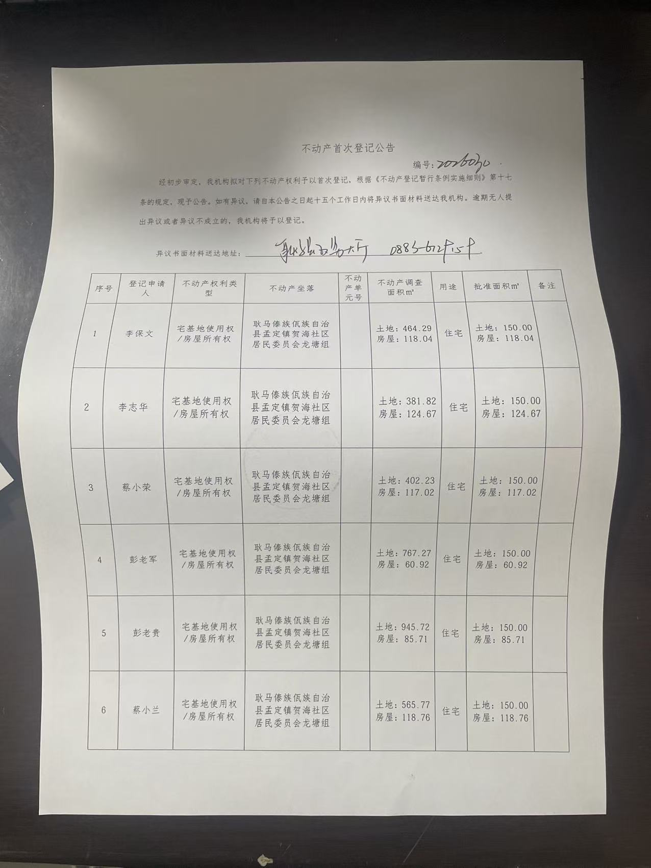 不动产首次登记公告(孟定镇贺海社区龙塘组8户)