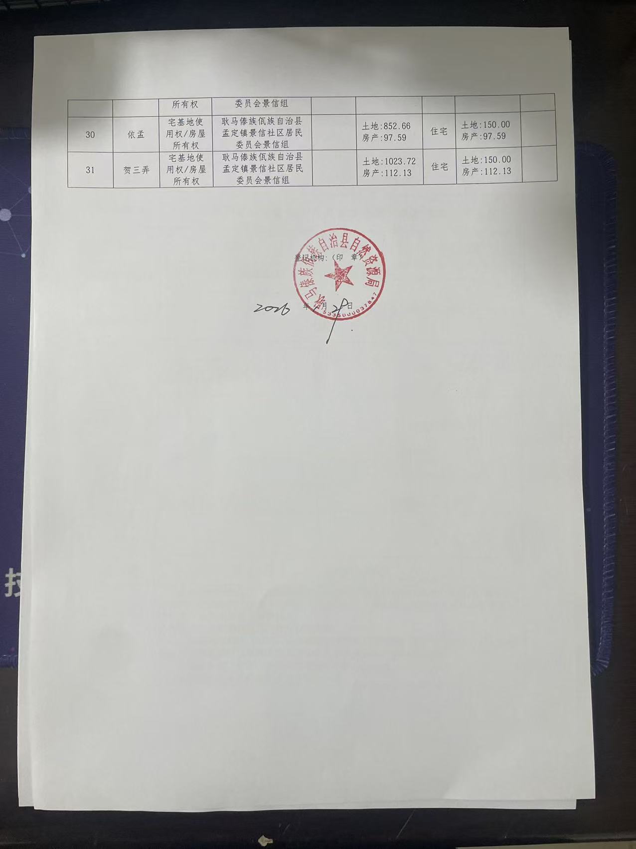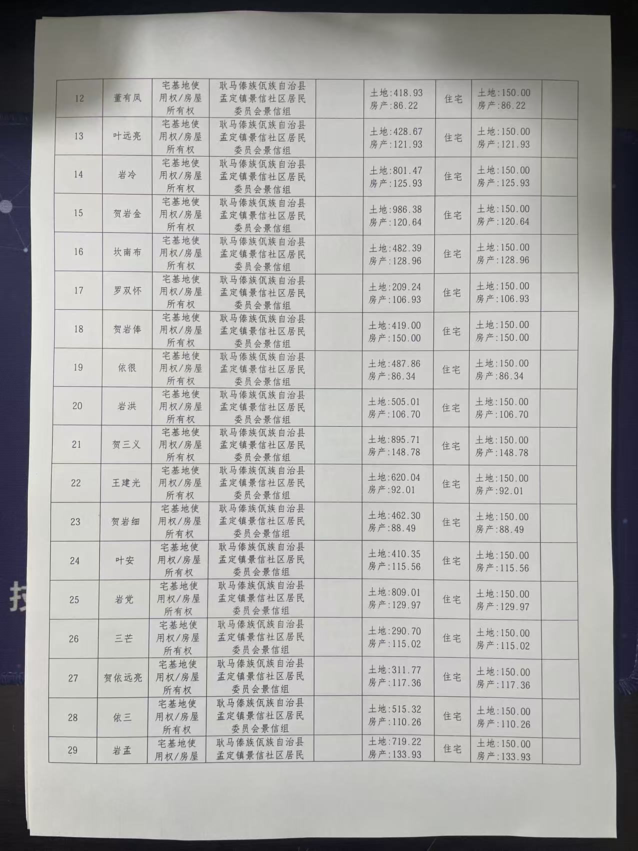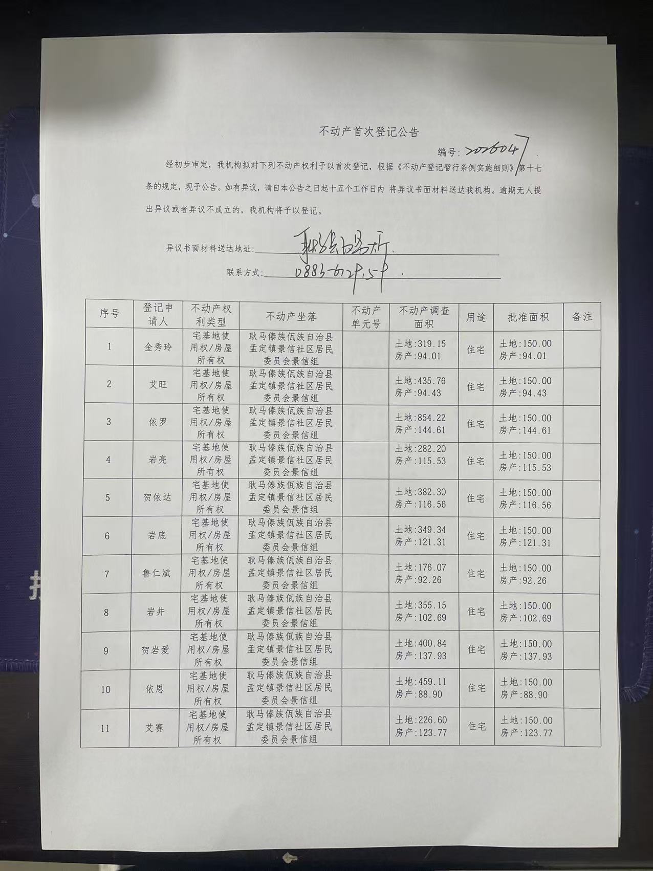 不动产首次登记公告(孟定镇景信社区景信组31户)