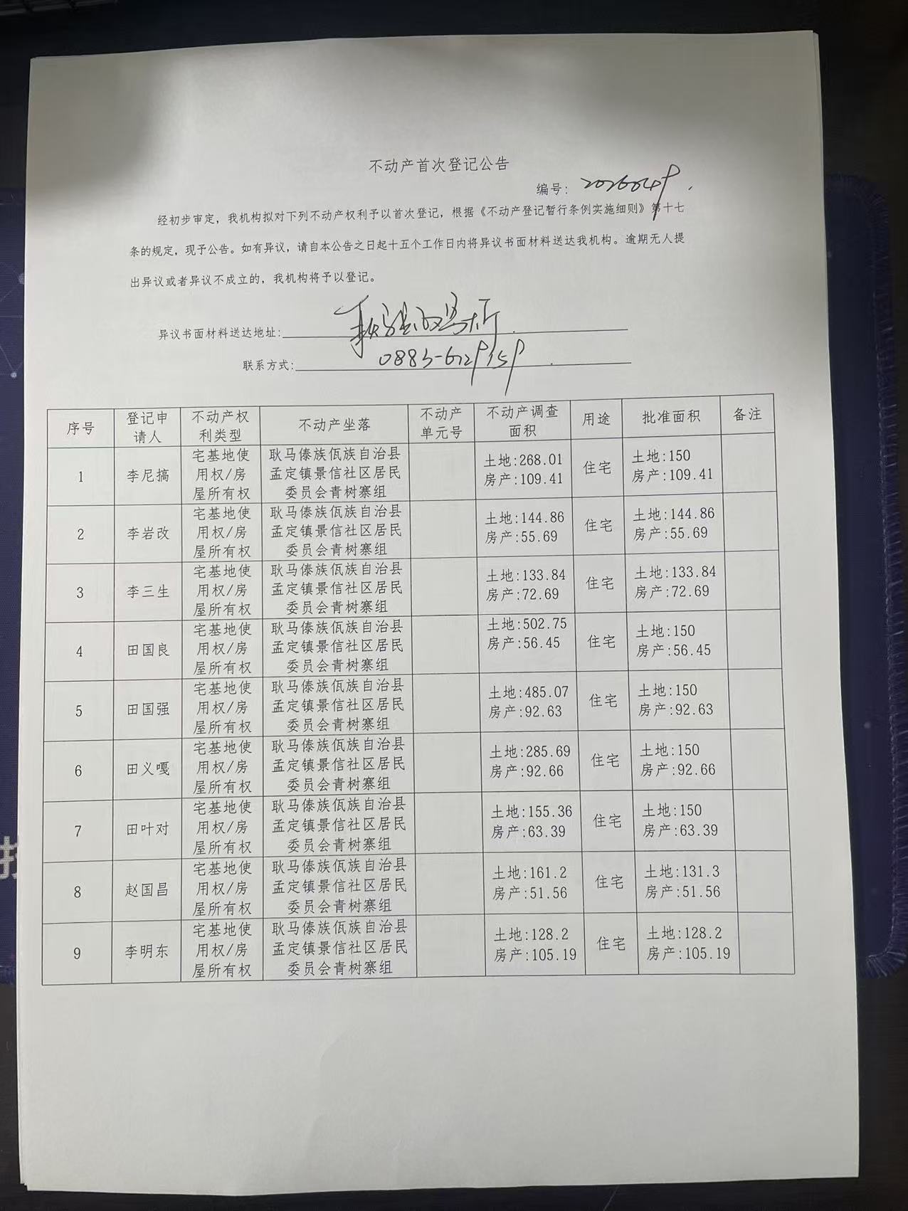 不动产首次登记公告(孟定镇景信社区青树寨组9户)