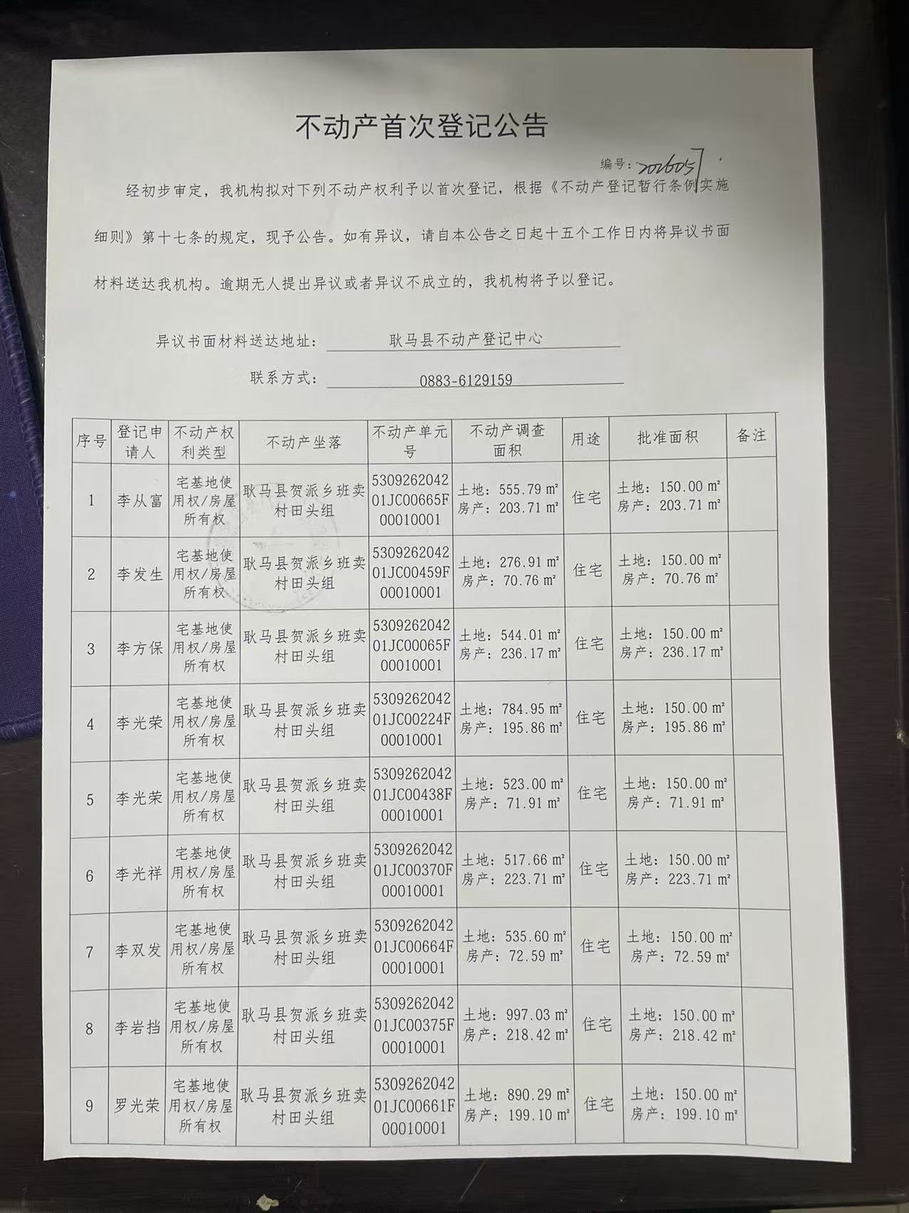 不动产首次登记公告(贺派乡班卖村田头组14户)