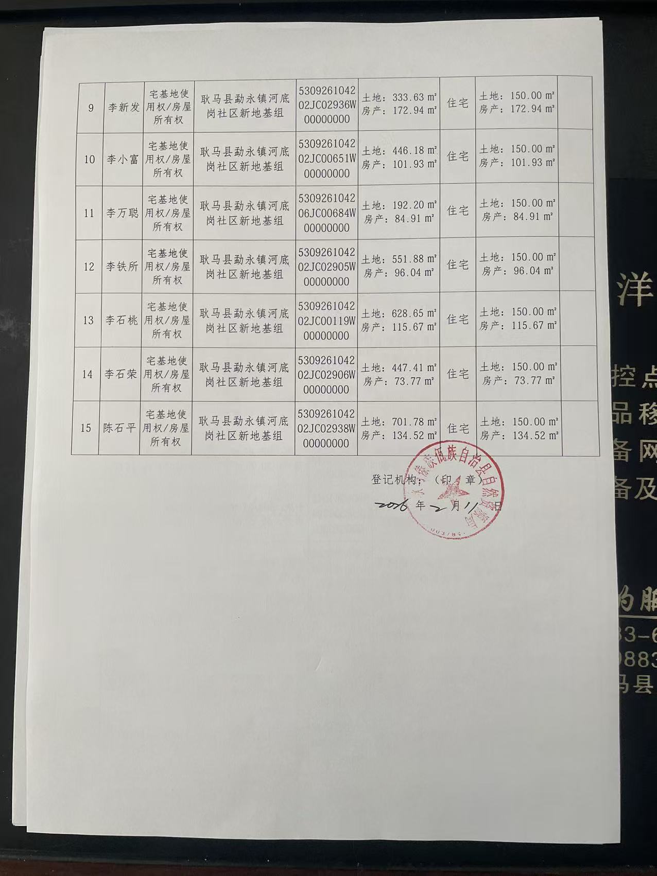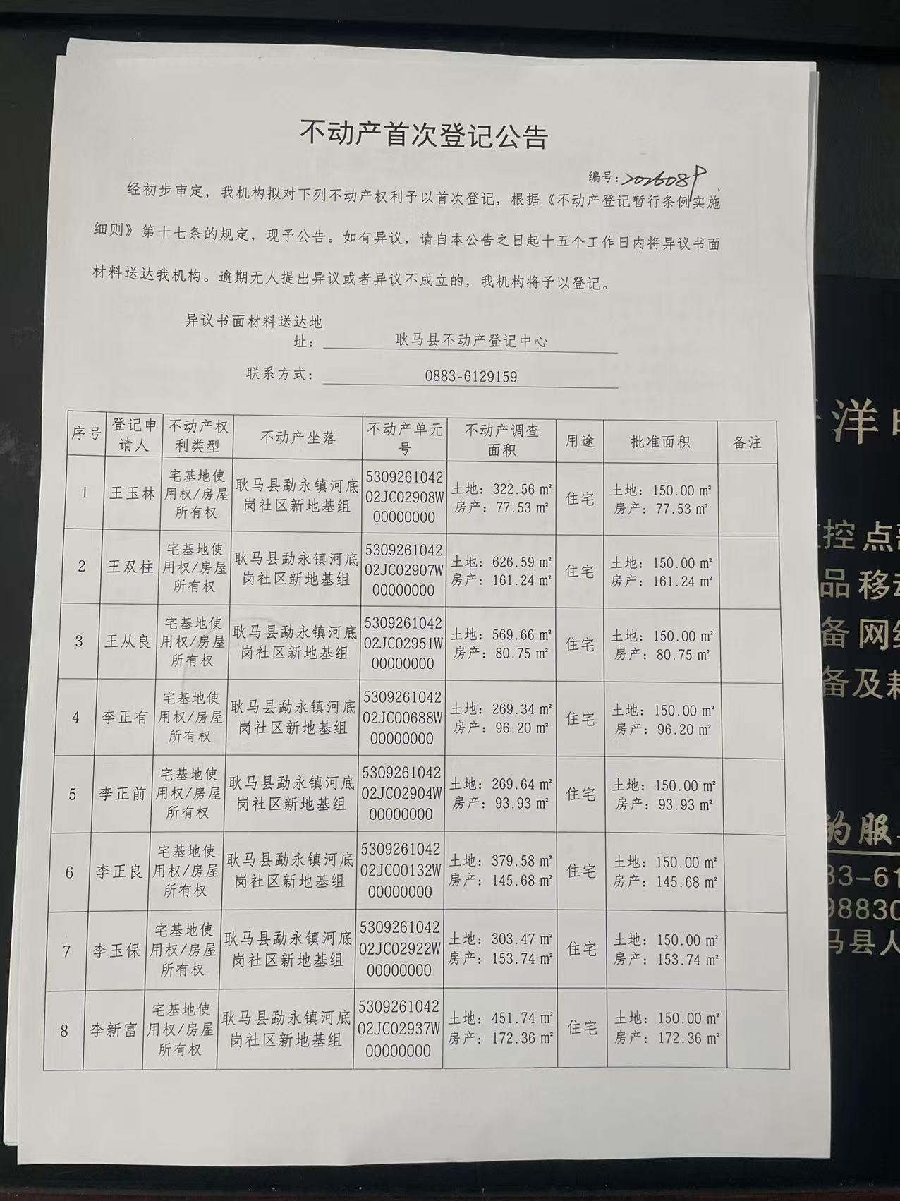 不动产首次登记公告(勐永镇河底岗社区新地基组15户)