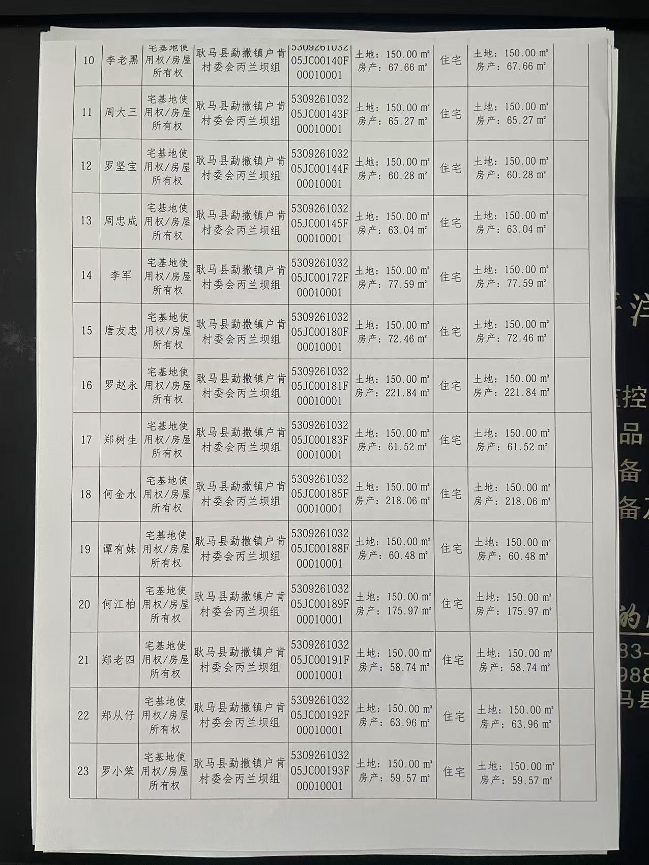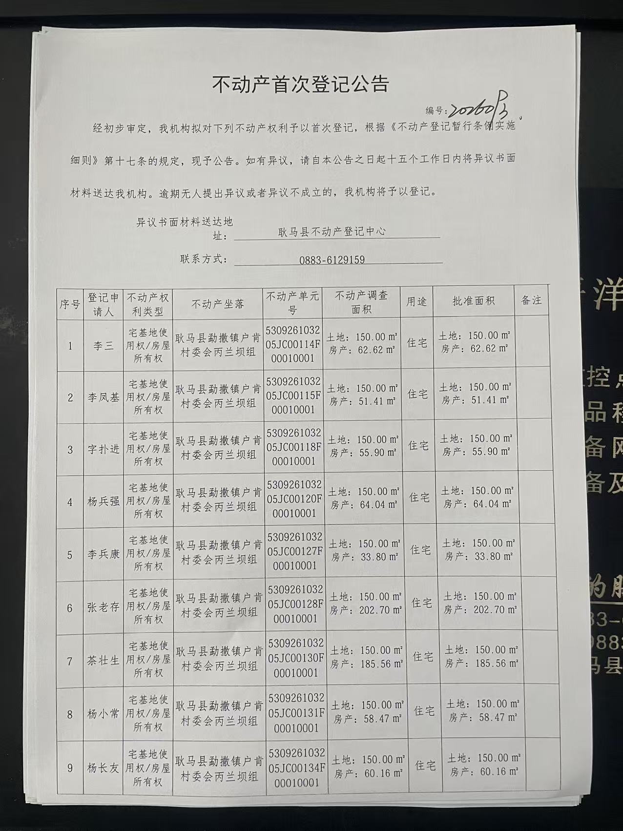 不动产首次登记公告(勐撒镇户肯村丙兰坝组64户)