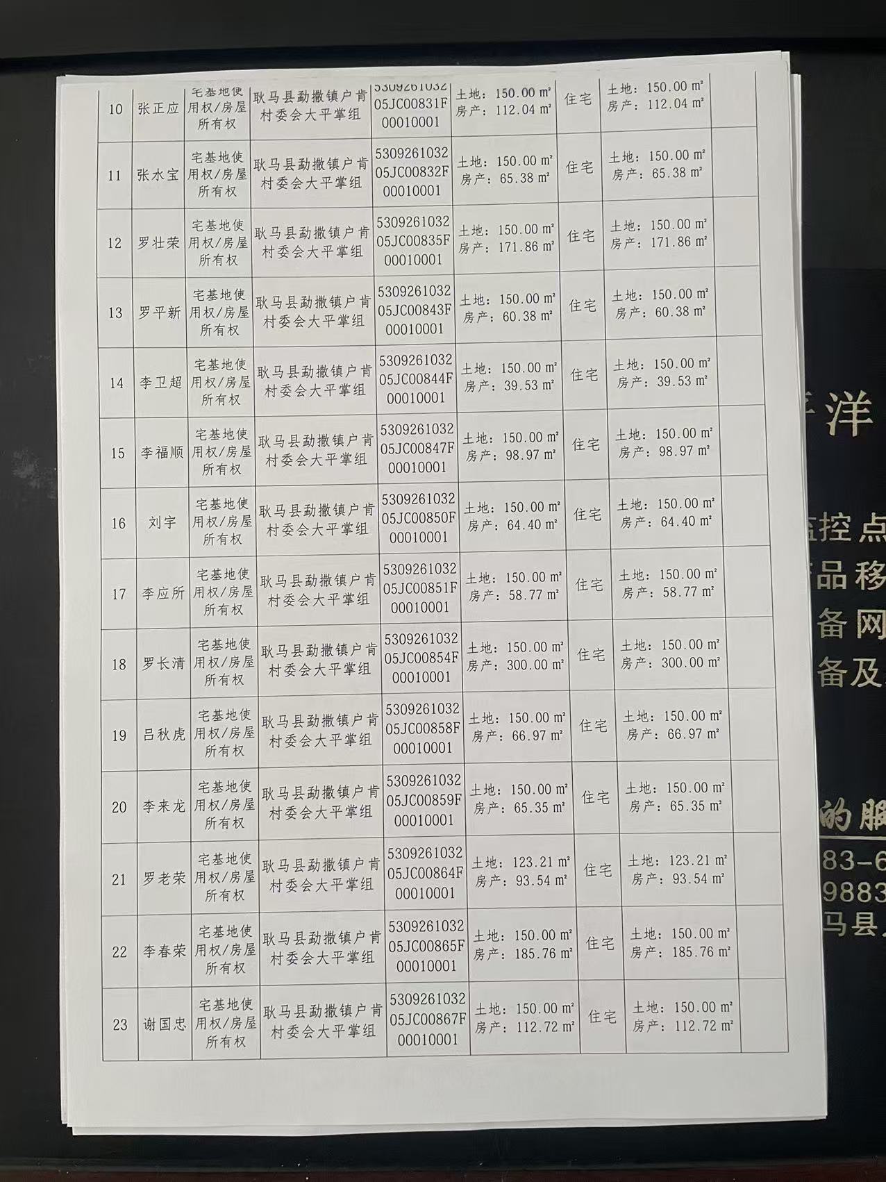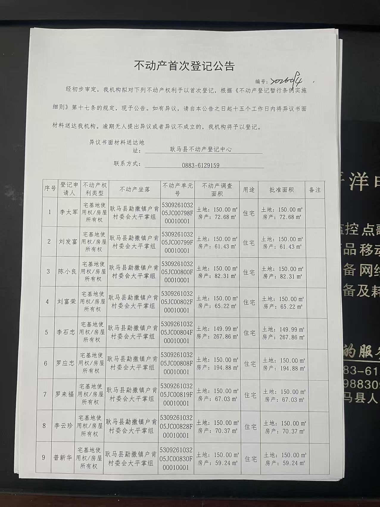 不动产首次登记公告(勐撒镇户肯村大平掌组43户)