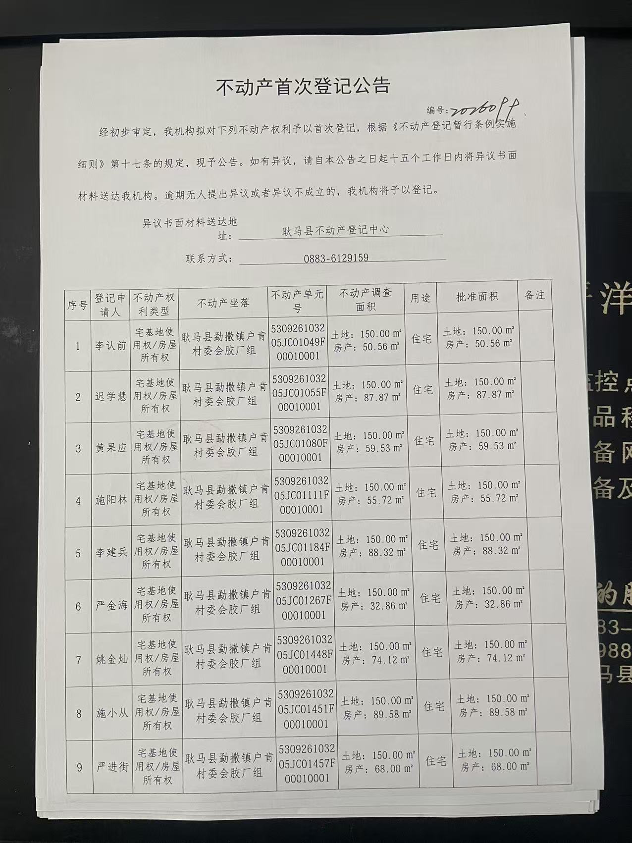 不动产首次登记公告(勐撒镇户肯村胶厂组16户)