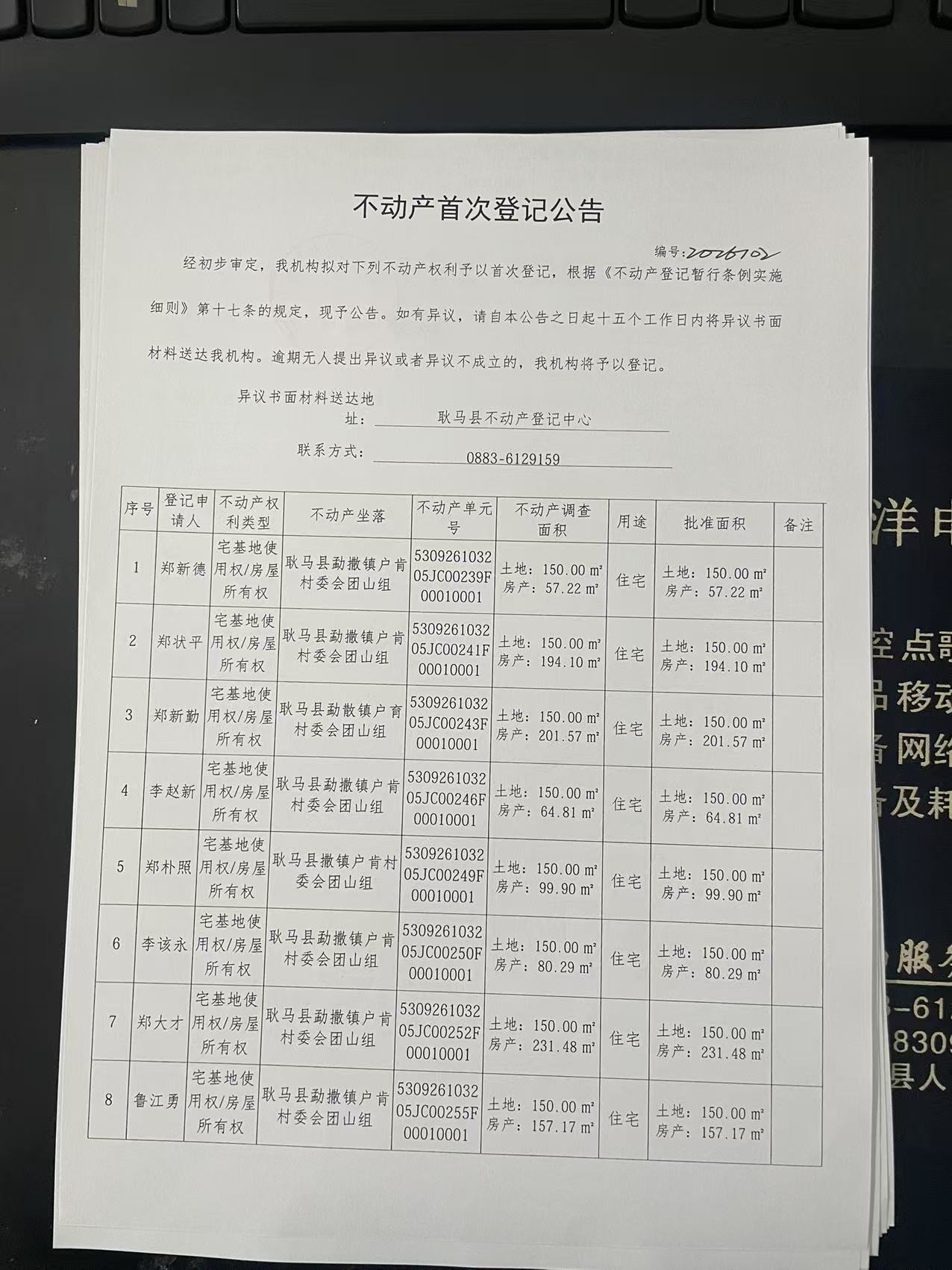 不动产首次登记公告(勐撒镇户肯村团山组9户)