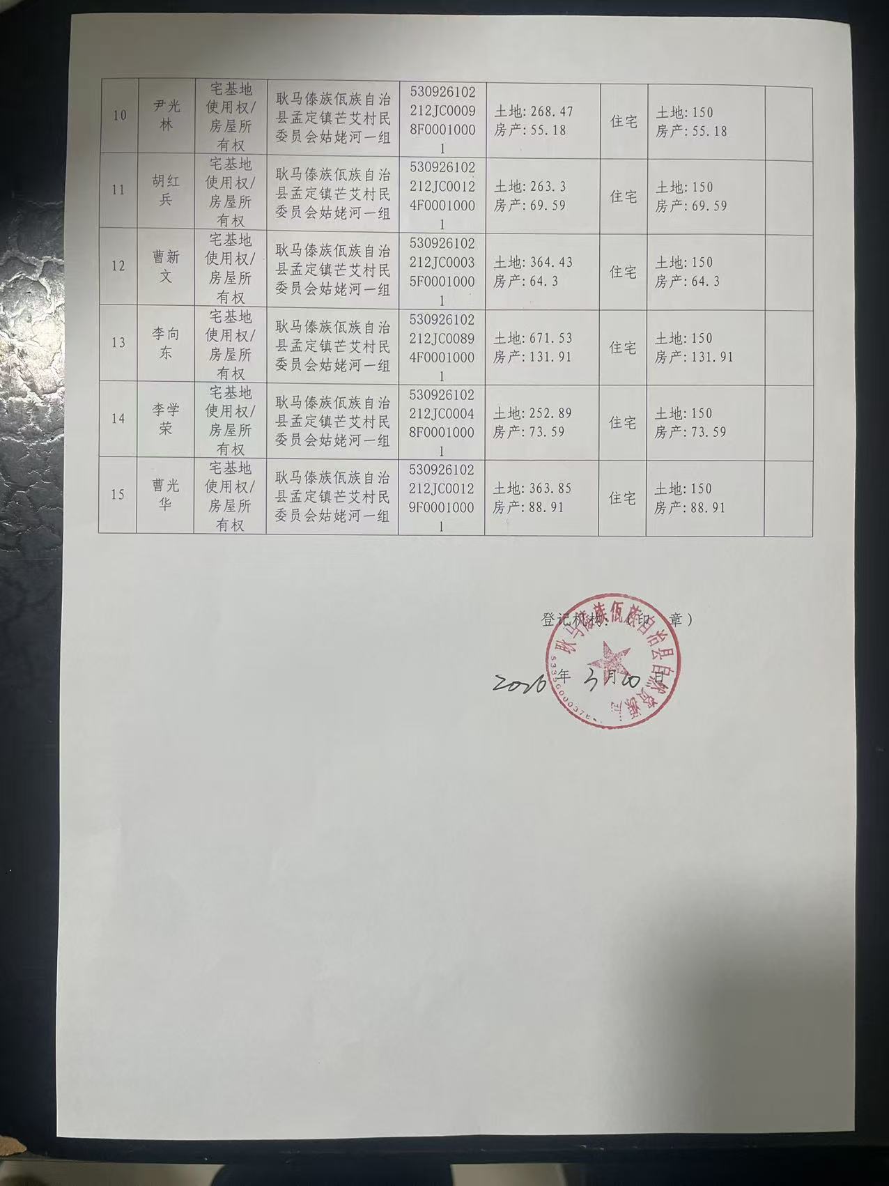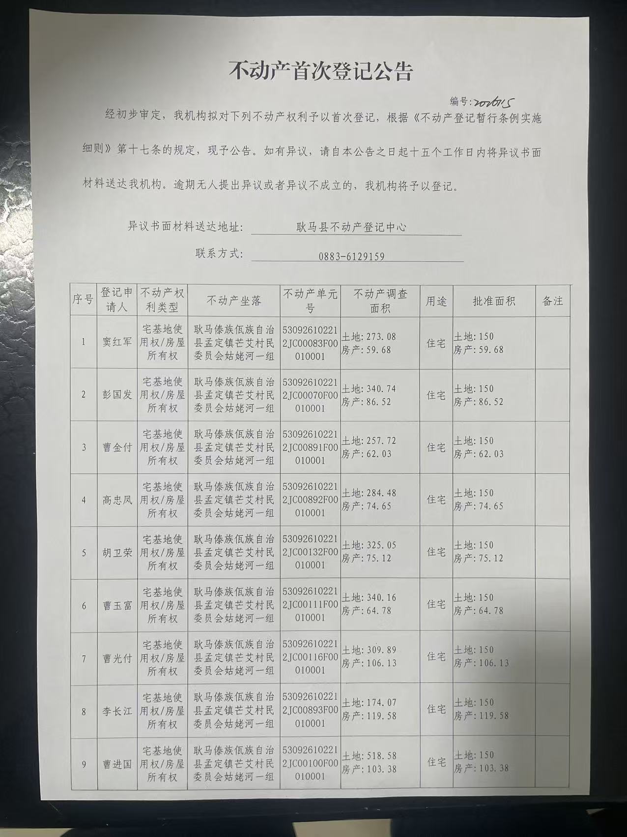 不动产首次登记公告(孟定镇芒艾村姑姥河一组15户)