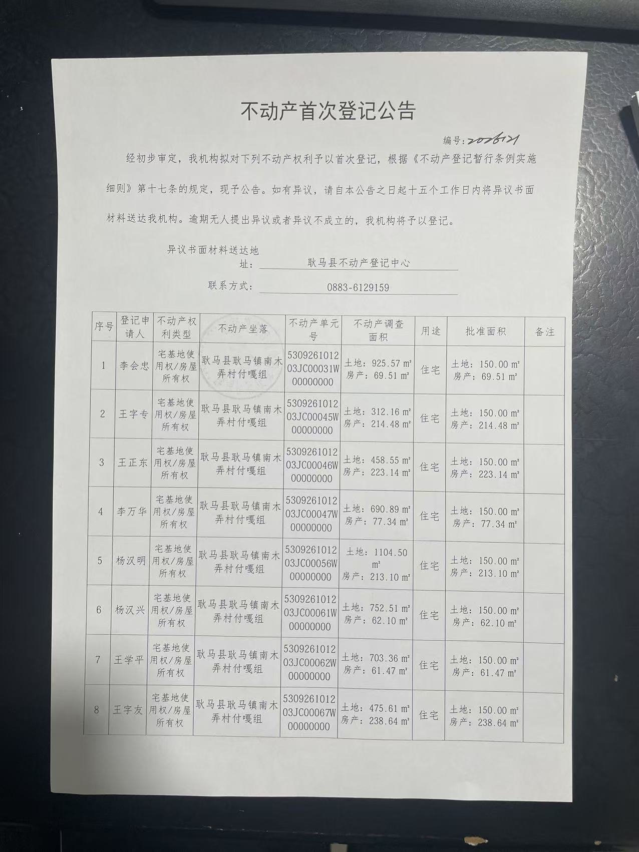不动产首次登记公告(耿马镇南木弄付嘎组12户)