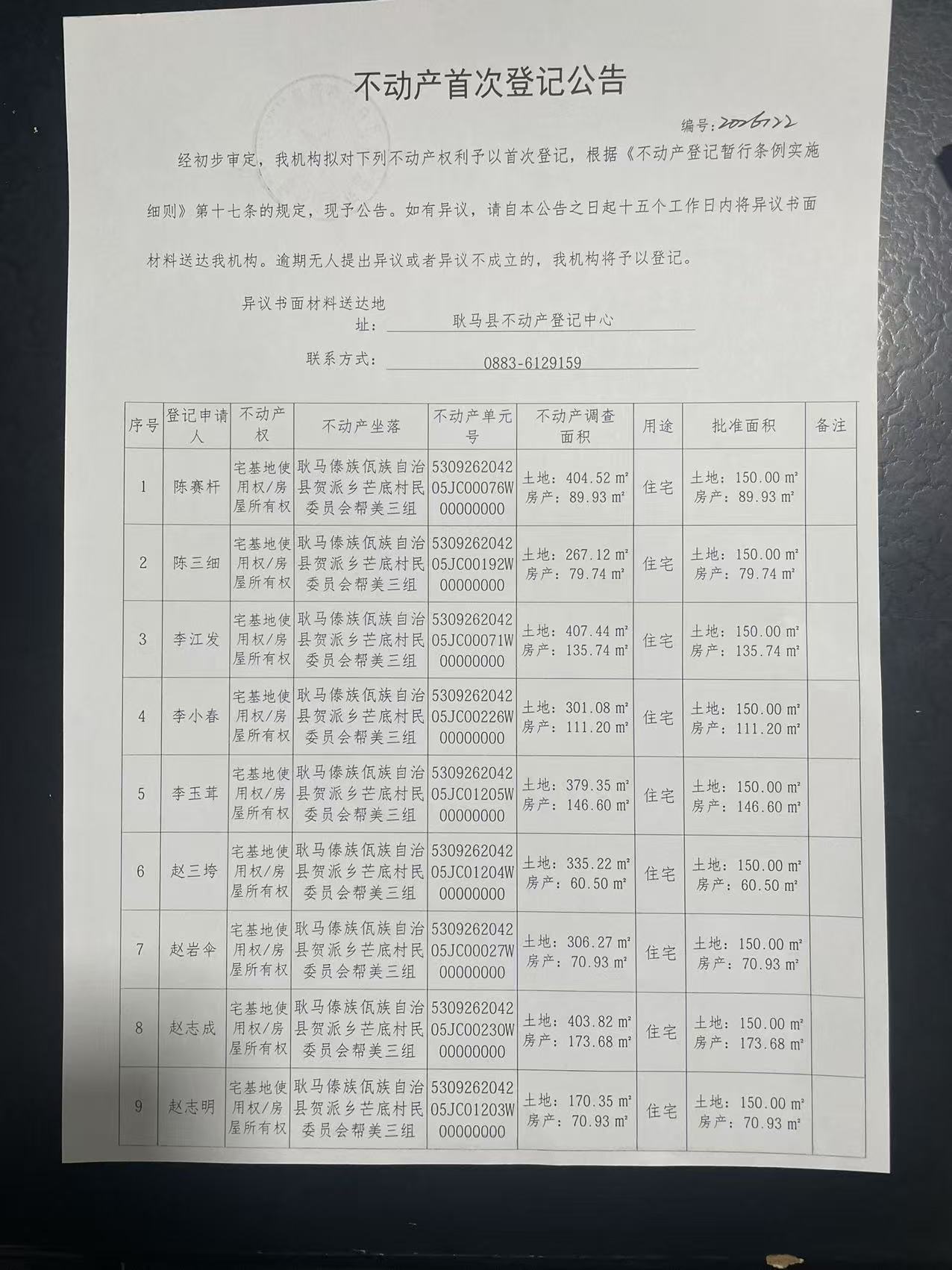 不动产首次登记公告(贺派乡芒底村帮美三组9户)