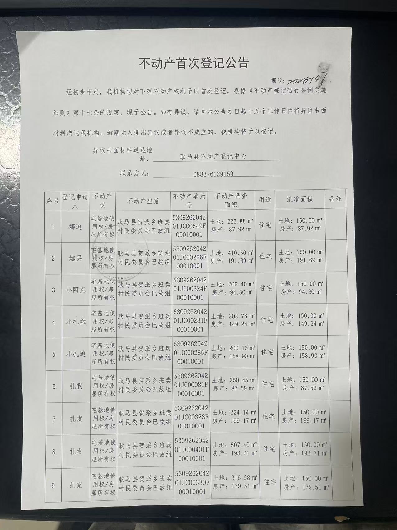 不动产首次登记公告(贺派乡班卖村巴故组14户)