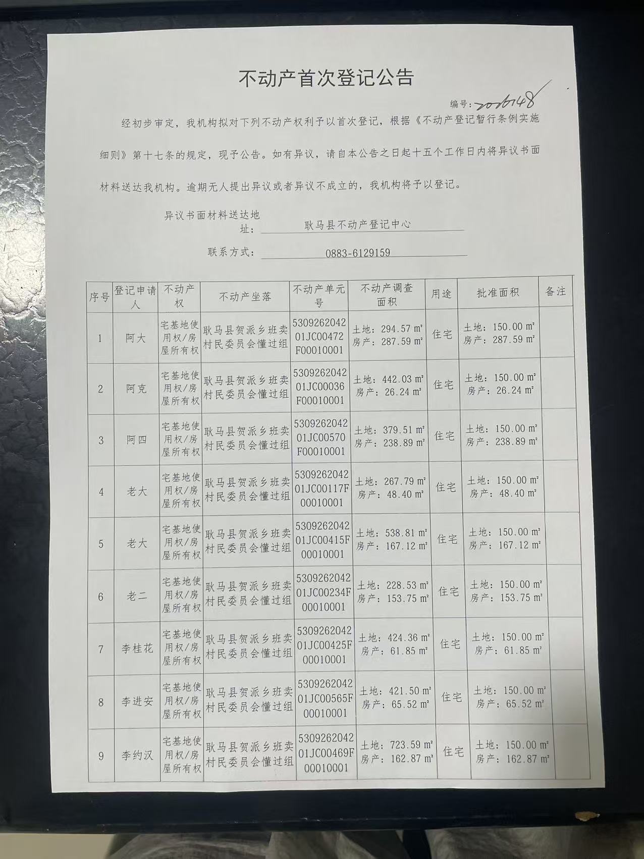 不动产首次登记公告(贺派乡班卖村懂过组42户)