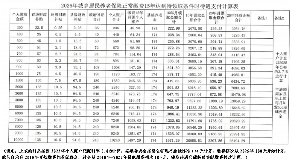 四、待遇领取:累计交满15年满60岁可按月领取养老金。月养老金=基础养老金(现行标准174元/月,缴费年限超过15年,每超过一年,每月多加发2元基础养老金)+个人账户养老金(满60岁时个人账户累计额÷139,个人账户按照“本金+政府补贴+利息”的方式复利计算),缴费档次越高、缴费年限越长,领到的养老金就越高。