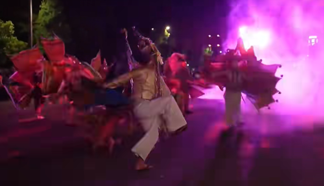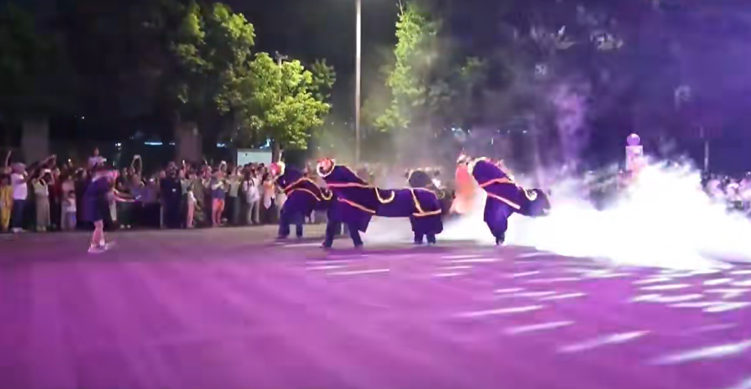 当晚8时,随着象脚鼓与铓锣声齐响,巡游队伍缓缓出发。孔雀花车率先登场,以竹骨为架、饰以翎羽,搭配傣式白塔与流光霓虹,在夜色中熠熠生辉 。紧随其后的白象、马鹿花车,生动呈现国家级非遗《白象舞》《马鹿舞》的吉祥寓意,舞者头戴面具、身着华服,步伐古朴,再现传统祈福场景。